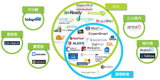 国外的公司比较偏向于个性化学习软件、智能辅导与仿真学习等辅助学习领域。Knewton的自适应辅助学习对学习效率的有一定提升作用,2011年亚利桑那州立大学(Arizona State University)有近2000名学生在使用Knewton之后,数学课程通过率从2009年、2010年的66-67%上升到74.5%,退课率从2009年、2010年的13.2-13.6%下降到5.6%,并且有50%的学生提前4周完成了学习计划。培生旗下的Mylab对超过10000多名学生进行研究,结果表明参加自适应学习计划的学生在模块考试中的成绩比不参加的学生高12.5%。