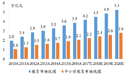根据国家统计局数据的估算,中国的教育市场预计在2020年将达到5.3万亿元,其中中小学教育市场将达到2.8万亿元。