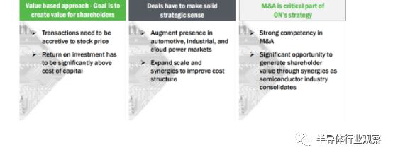 对于安森美来说,并购的最大目标或价值就是为股东们回报,所以投资回报一定要比并购成本大才可以,并购必须要有战略意义,一定要增加公司在汽车、工业及云计算电力供应等领域的领导地位,同时并购可以产生协同效应,包括扩大公司的市占率或者可以有效的缩减成本开销。
